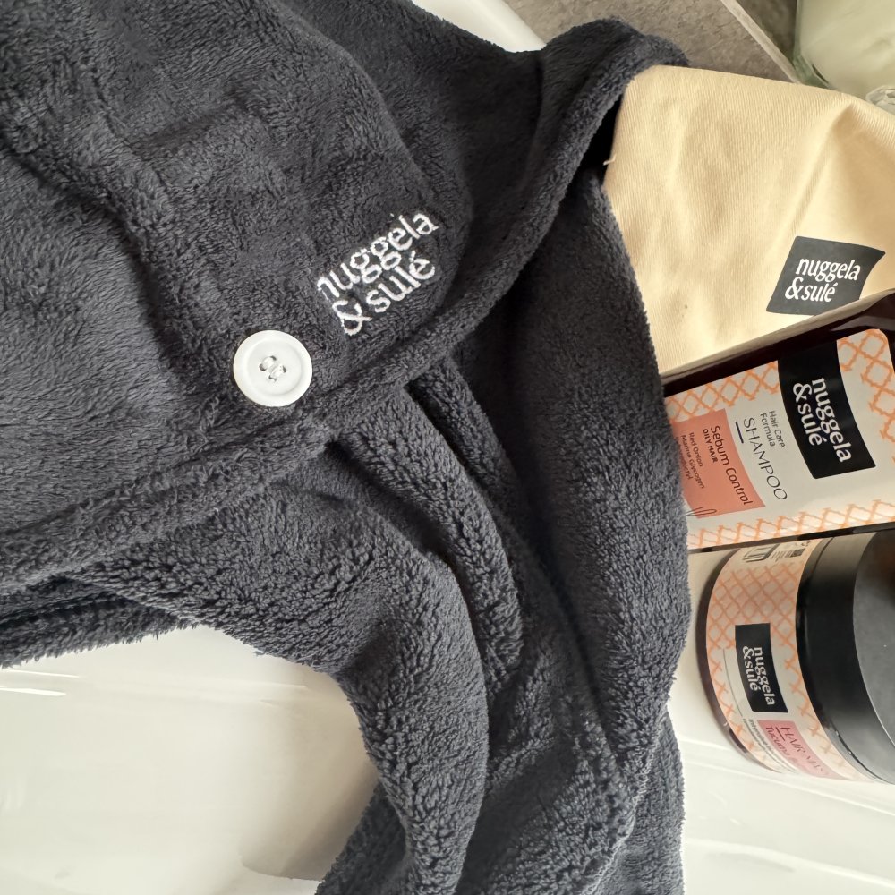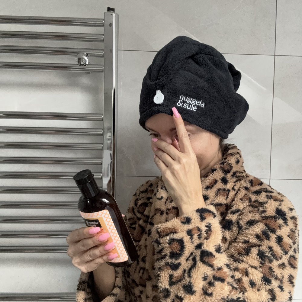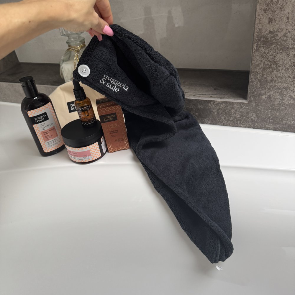 Prírodné šampóny a kondicionéry Nuggela & Sulé – uterák podporí ich účinnosť tým, že jemne pripraví vlasy na vstrebávanie aktívnych látok.